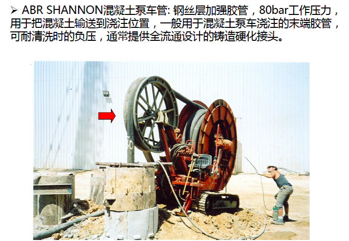 應(yīng)用范圍: 鋼絲層加強(qiáng)膠管,85bar 工作壓力,用于把混凝土輸送到 澆注位置;一般用于混凝土泵車(chē)澆筑的末端膠管,管子可以耐清 洗時(shí)的負(fù)壓,通常提供全流通設(shè)計(jì)的鍛造硬化接頭